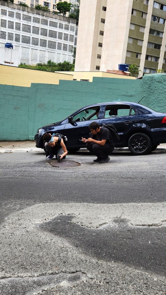 Hydrolinguistische Fabulation — Abhorchen der Gullys entlang des verborgenen Saracura Flusses; Foto — Team Ground Atlas, Workshop »Sara Cura«, São Paulo, 2023